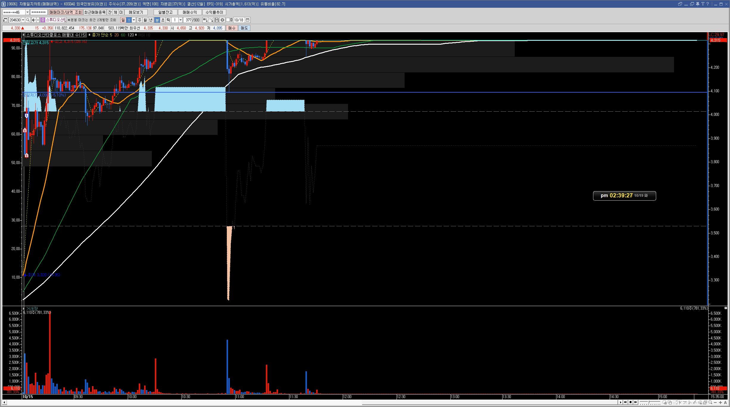 매수세가 점차 강해지면서 결국 수익권까지 올라갔고 적당한 선에서 일부 매도를 하여 수익을 챙겼습니다.