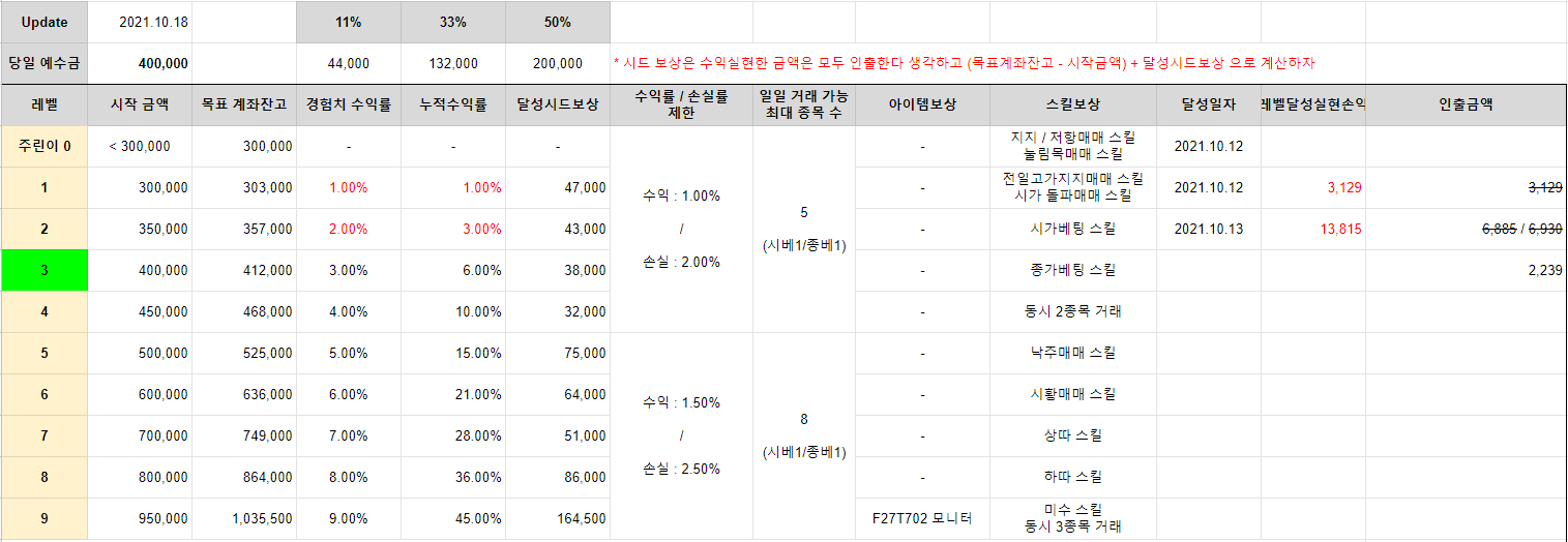 금일부터는 주린이 3 레벨이 되어서 예수금이 40만 원으로 세팅되었습니다!ㅎㅎ