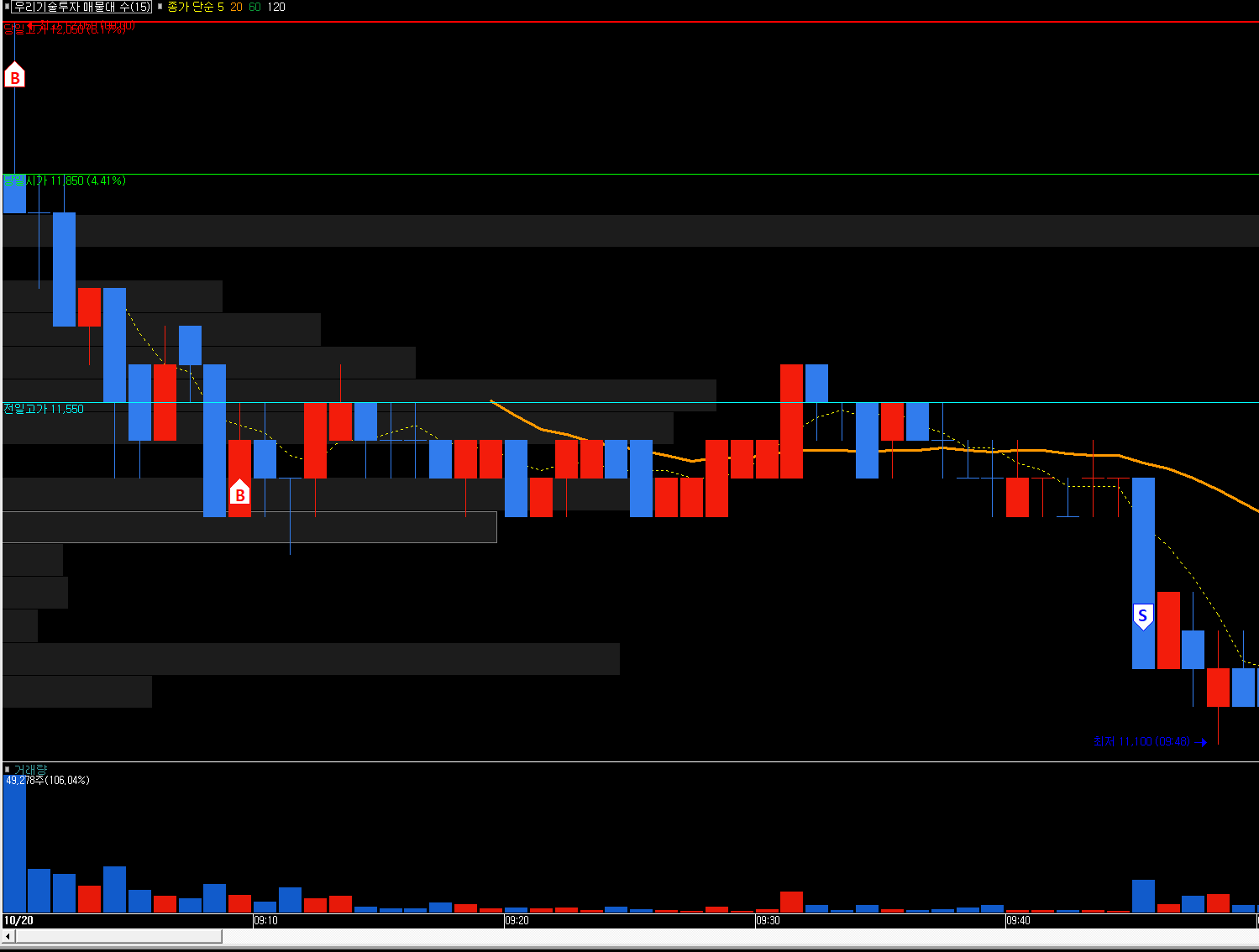 매수 이후 매도세가 강해지고 전일고가 지지를 받지 못하는 것처럼 보여서 본절로 대응하였습니다.