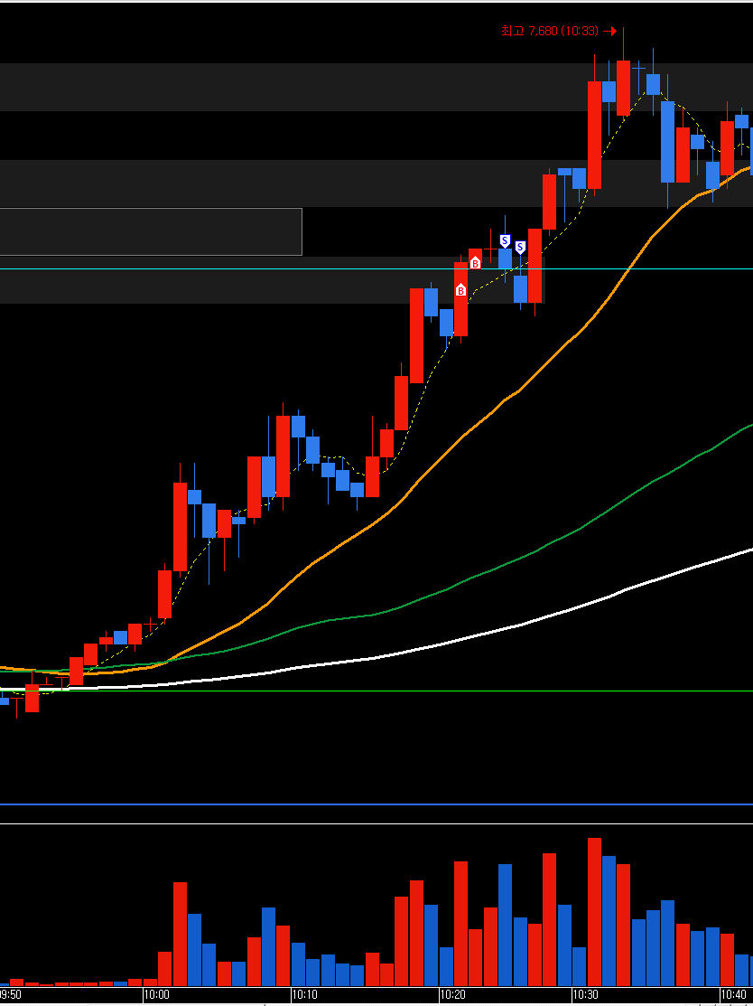 VI가 풀리고 강한 매수세에 힘입어(?) 갭상승으로 시작하였고 살짝 이익실현 매물들을 소화하고 다시 쭉 올라갑니다.