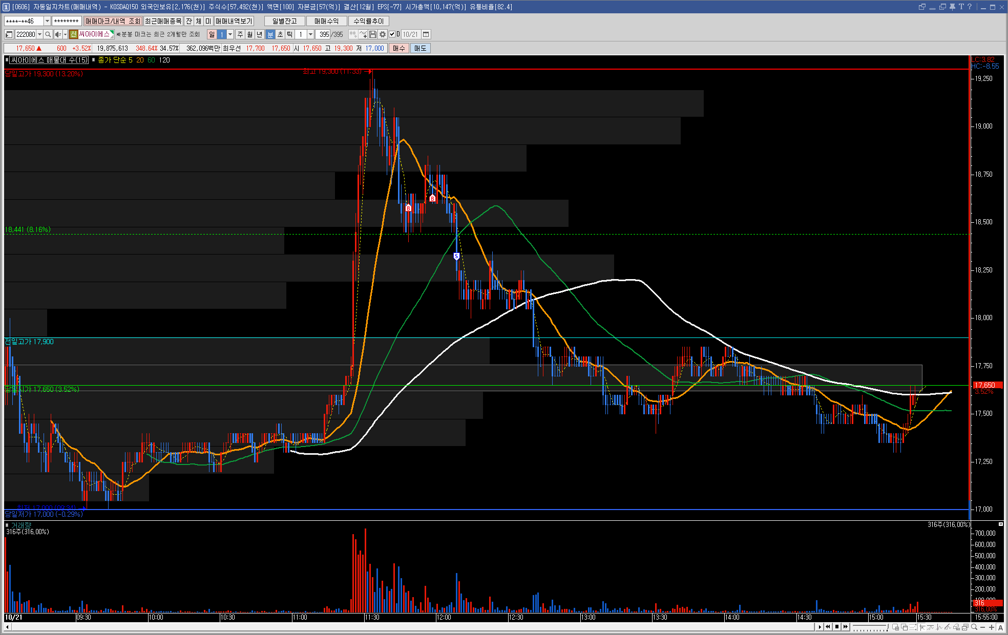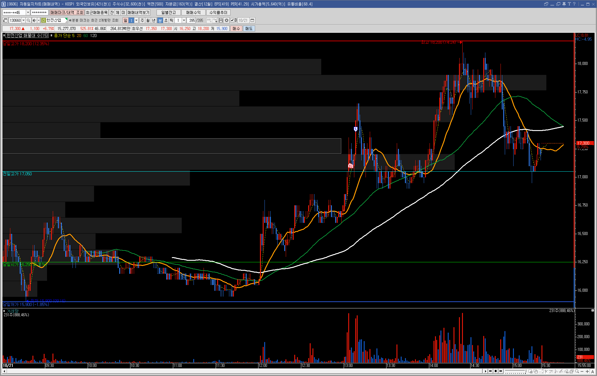 일봉상 전고점인 7월 6일 18,600원을 얼마 남기지 않은 상태였고, 슈팅이 나오면 도전을 해보겠다 싶었습니다.