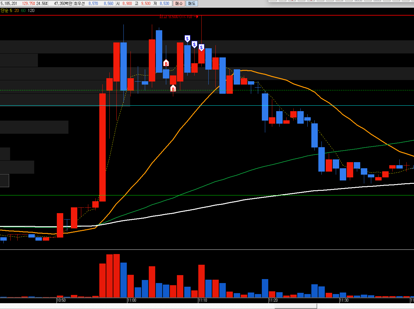장 초반 시초가 아래로 밀린 상태에 있다가 시초가 돌파 이후 강하게 슈팅을 하였습니다.