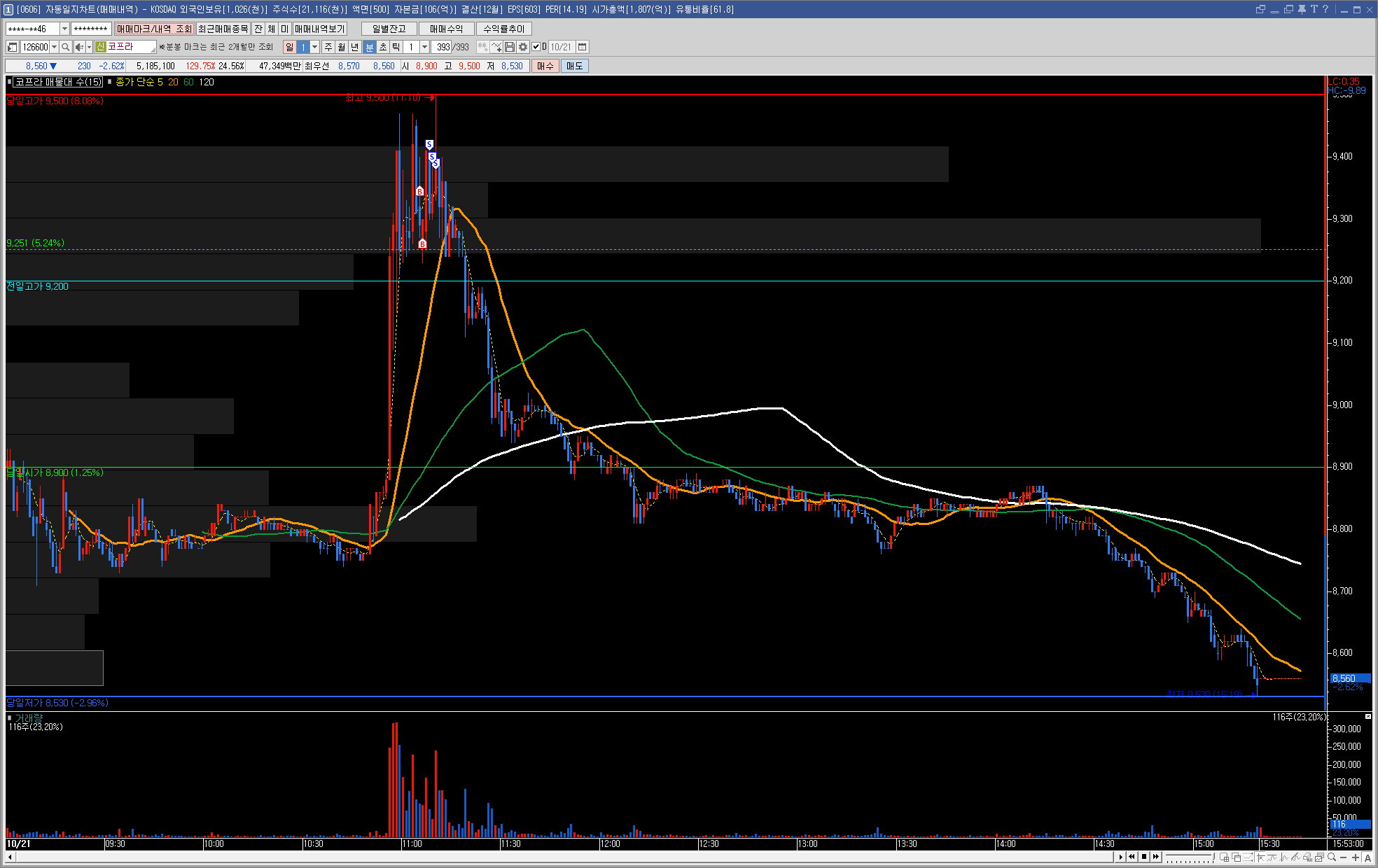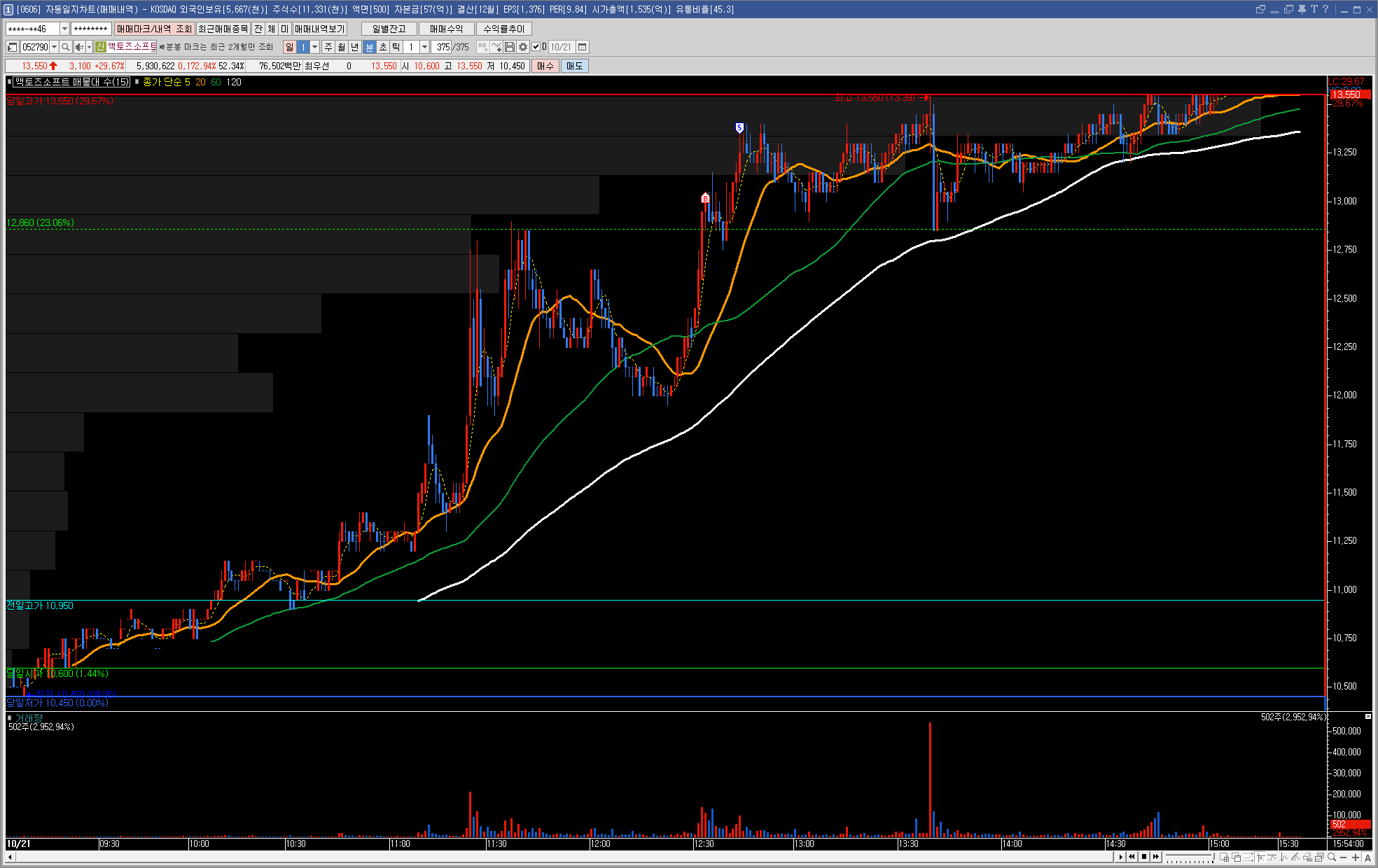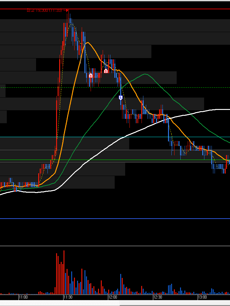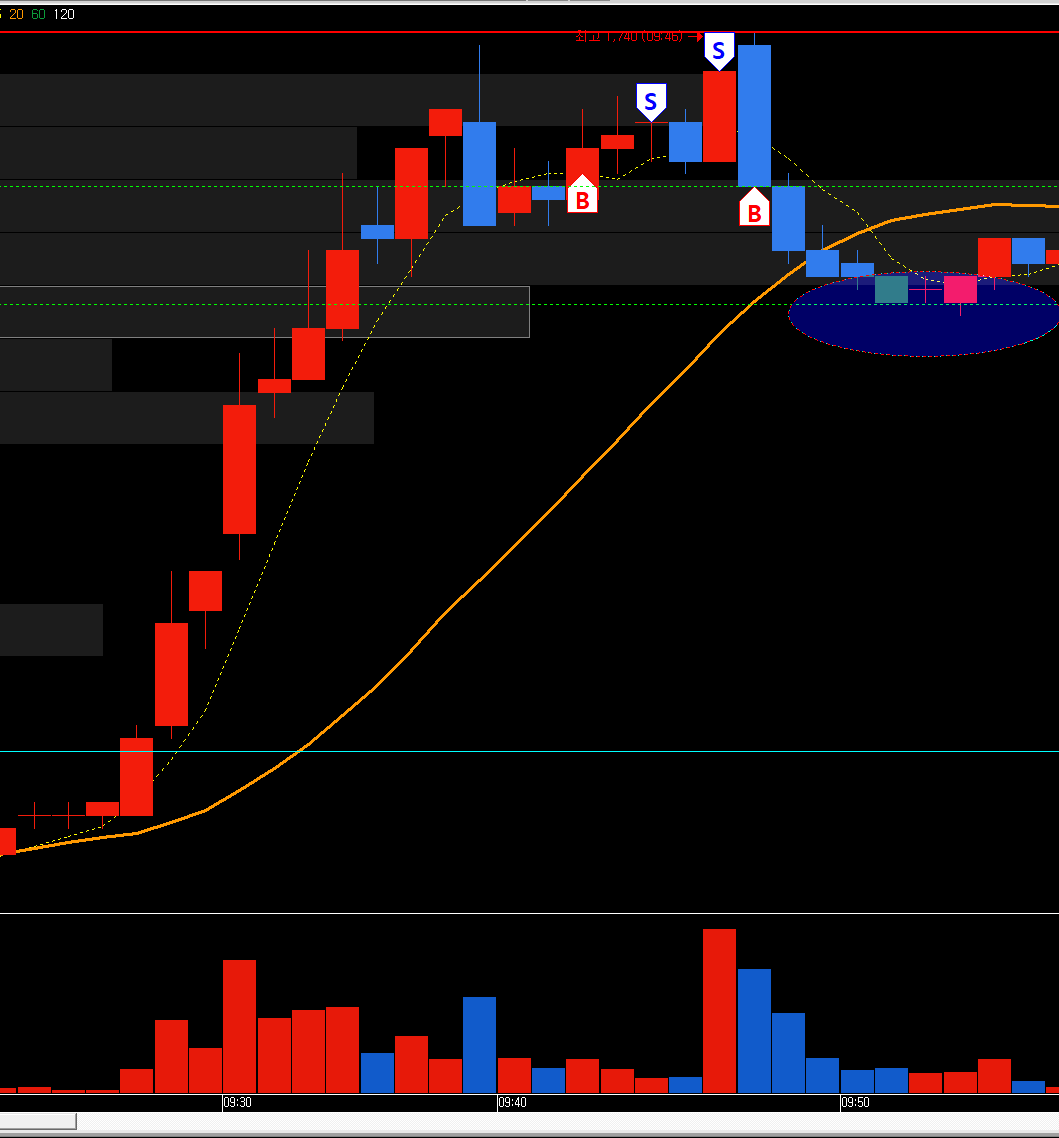 장 초반 시초가 아래로 밀린 상태에 있다가 시초가 돌파 이후 강하게 슈팅을 하였습니다.