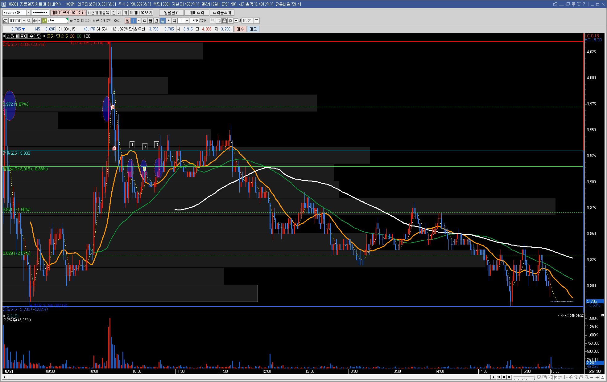 전일 고가가 3,930원이었고 이 부분을 지지점으로 예상하여 매수했습니다.