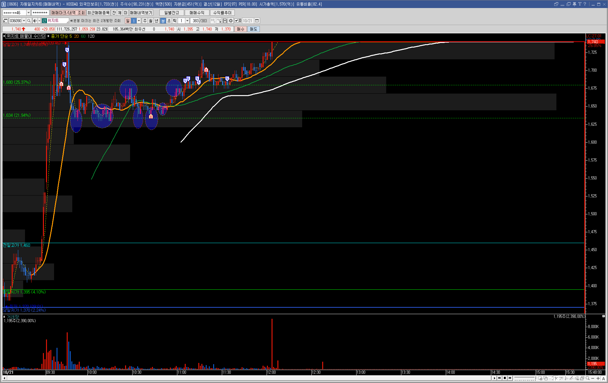 이후 최고가를 갱신하고 매도세가 강해져서 나머지 전량 매도 처리하여 수익을 확정 지었습니다.