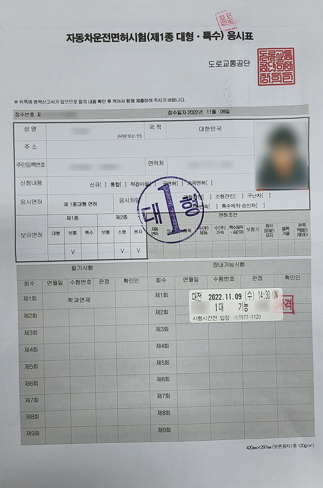 특수면허가 있으면 면제이긴 한데, 저는 아직 원서만 가지고 있고 면허를 발급받진 않았습니다.
