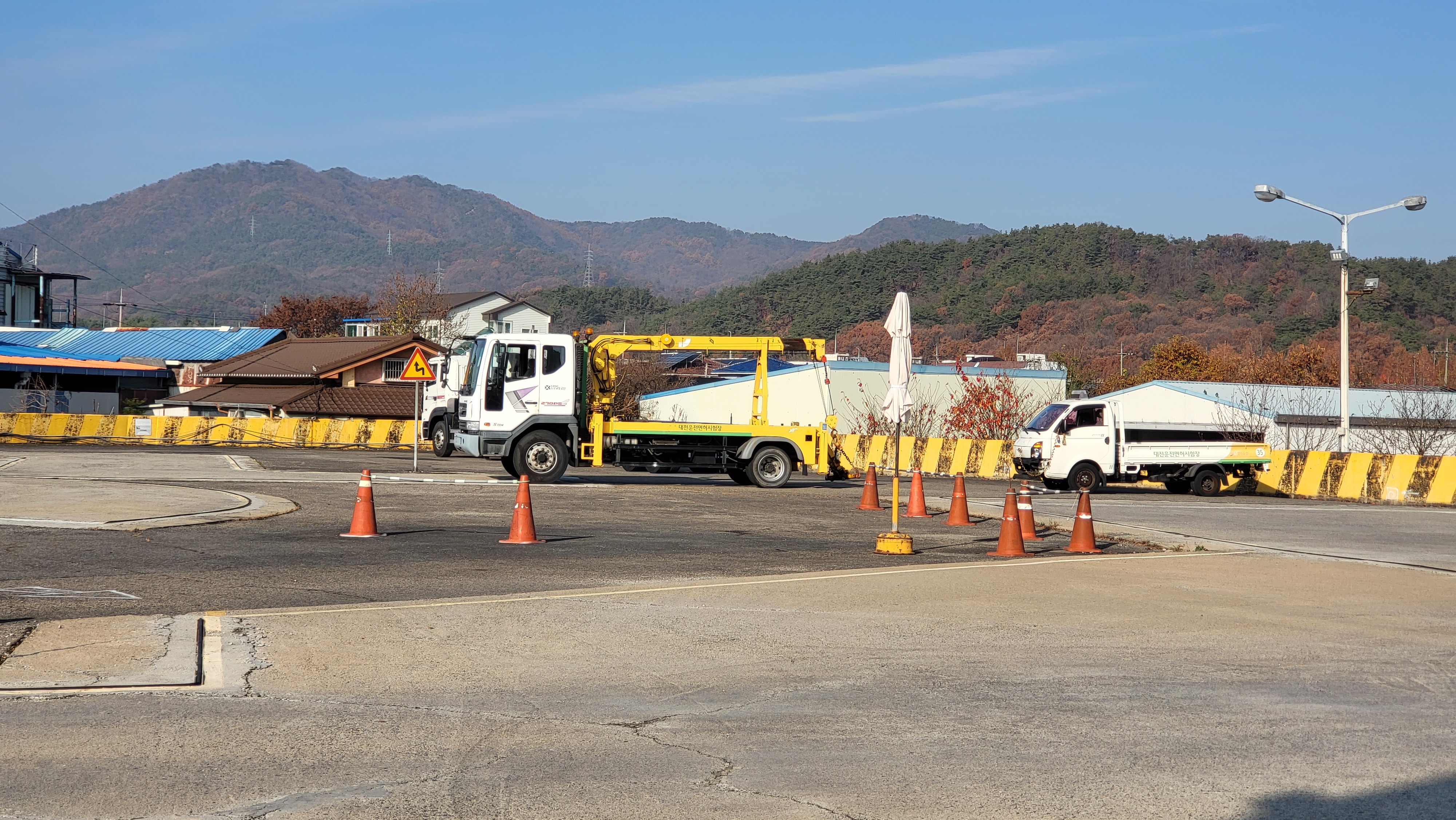 2 굴절 진행하면서 너무 멀리서 핸들을 꺾고 진입하는 바람에 피견인차의 각도가 꺾이지 못하고 펴진 상태가 되더라고요..