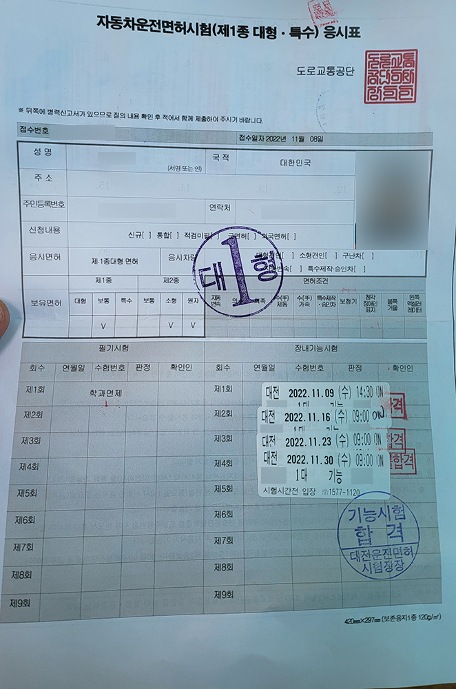 그렇게 마지막 시험인 1종대형도 무사히 합격으로 끝이 났습니다.